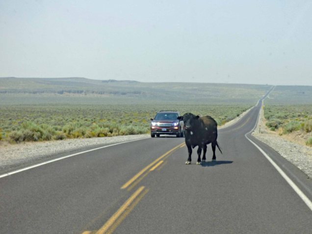 Here is the excitement for that section of the trip. We crested a rise in the road and this bull walked out in front of us.  He turned to challenge us and stared for a minute or two until another car approached from the other direction.  Then he ambled on across the road.