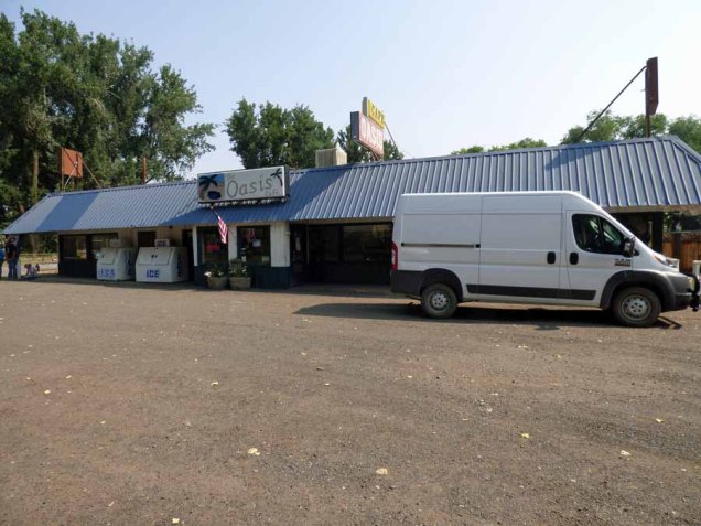 After many miles, we saw what looked like a couple buildings in a grove of trees in the distance. It was lunchtime, but we stopped for breakfast at the Oasis. It was filled with ranchers eating and talking. I noticed that four or five parties stopped and came in to use the toilets without stopping to eat. Our omelets were large and tasty.