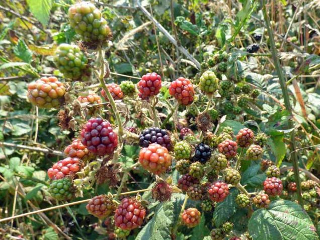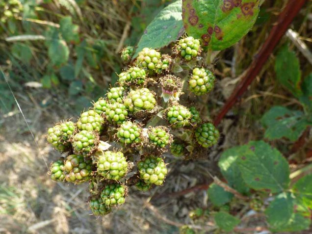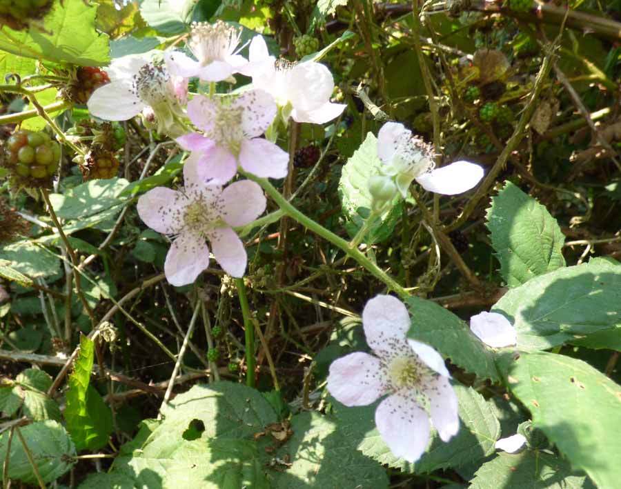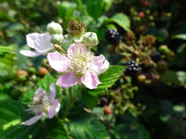 The blackberries are not quite ripe yet although there were enough black ones for me to eat my fill as we walked along. I was surprised to see blossoms in a few places.