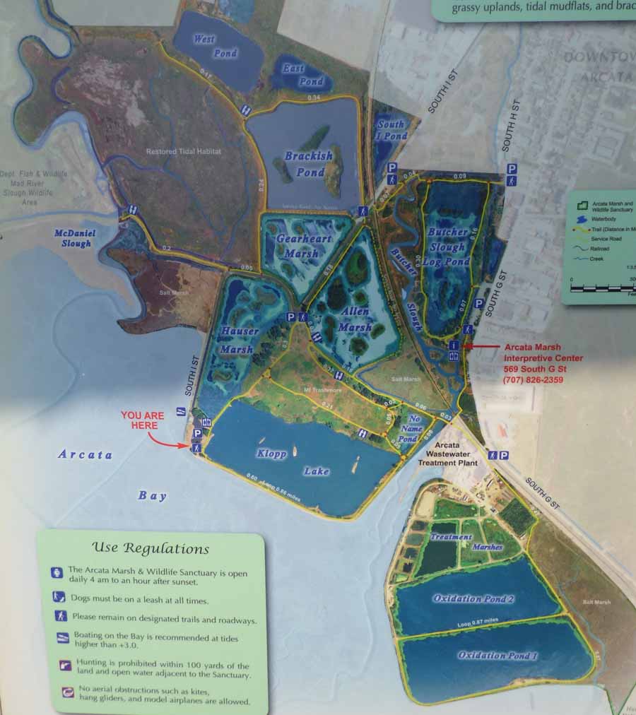 “At the north end of Humboldt Bay, a short walk from downtown Arcata lies a gem known as the Arcata Marsh and Wildlife Sanctuary. Before it was repurposed as a wastewater treatment plant and wildlife sanctuary in 1981, the property housed a landfill and lumber mill. Over the years, it has grown to a 307-acre mosaic of freshwater and saltwater marshes, brackish ponds, tidal sloughs and mudflats, grassy expanses, and wooded areas.