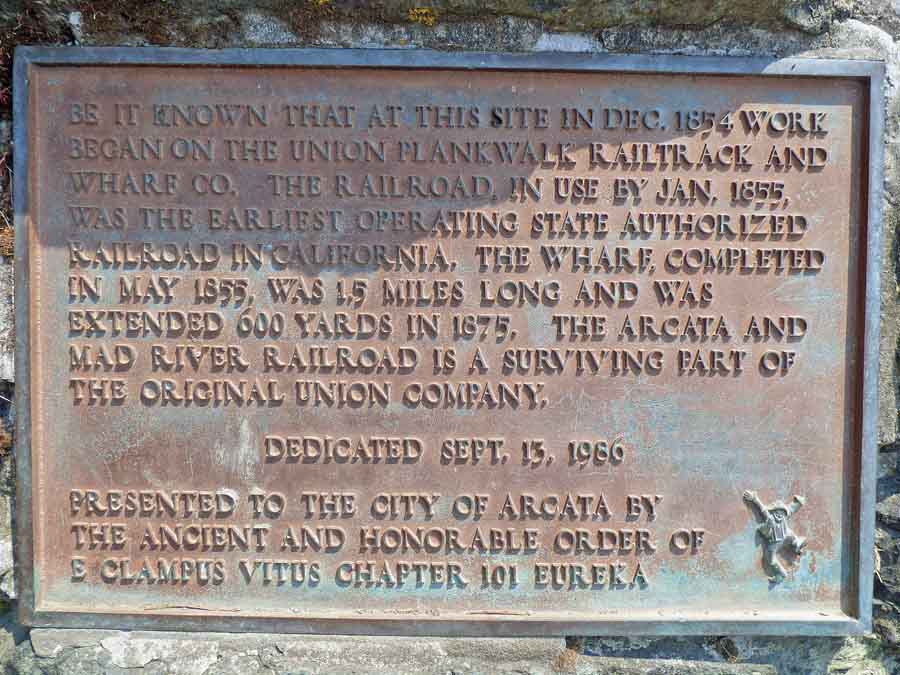 This boulder has a plaque marking the remains of an old railroad bridge across the bay.