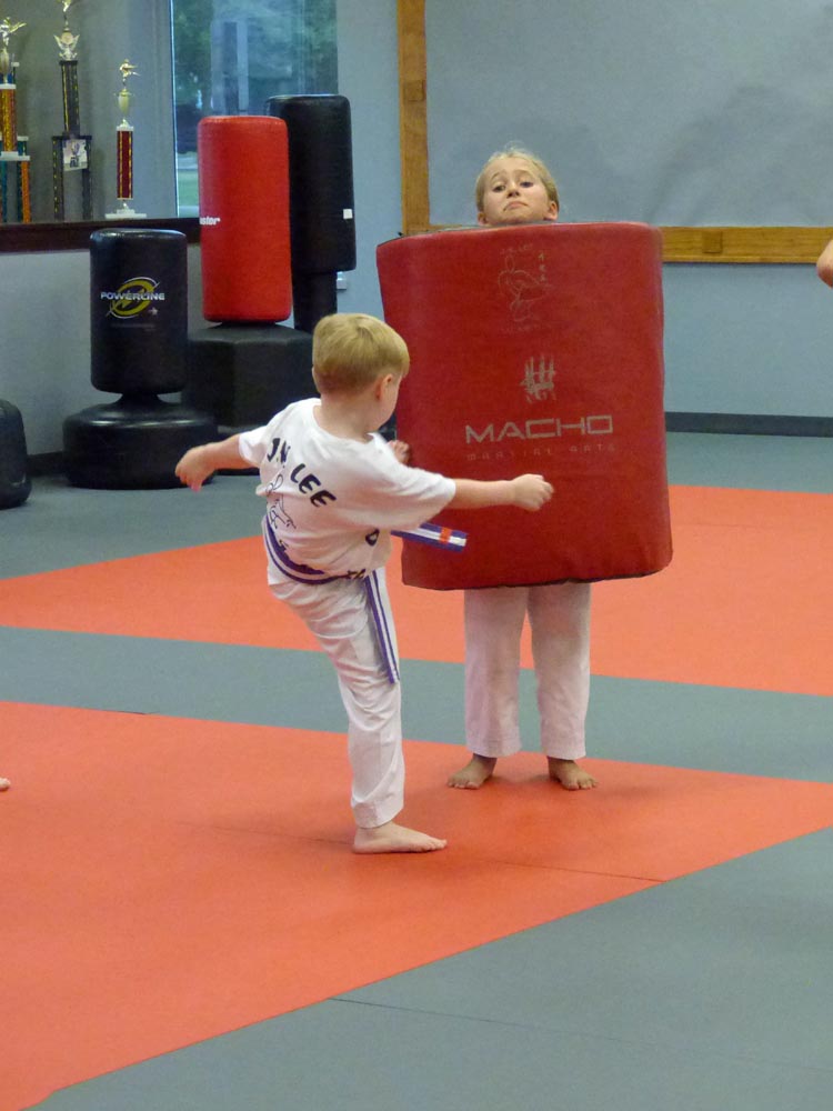 It is not enough to kick; they have to be accurate too. They also practiced with small targets. My camera timing was not right, but Owen did a good job of kicking high in the air (for him).