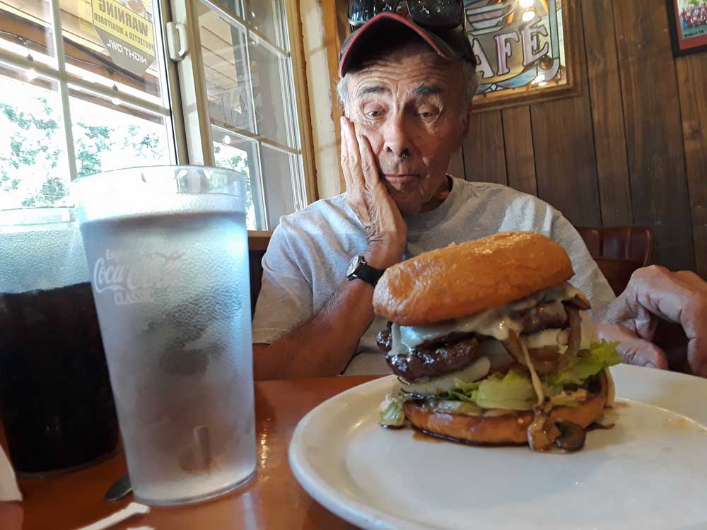 Another man in the restaurant who had also ordered a hamburger stopped by our table. He commended Andy on how much he was eating and said, “That hamburger was so big, I couldn’t jump over it”. Andy did not attempt to pick it up; he ate it with a knife and fork.