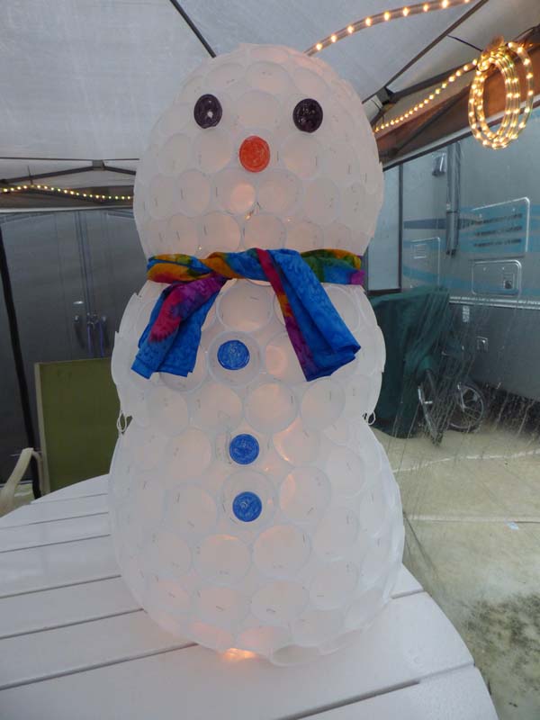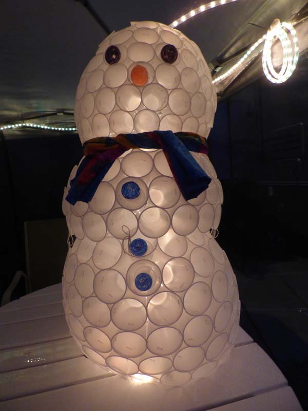 Two years ago, we went to Wisconsin in December for my exceptional grandson Cam’s birth. While there, we went to Discovery World Science and Technology Center. Just inside the door was a snowman made of plastic cups. Here is Daughter Jennifer holding newborn Cam and admiring the snowman. I was charmed.