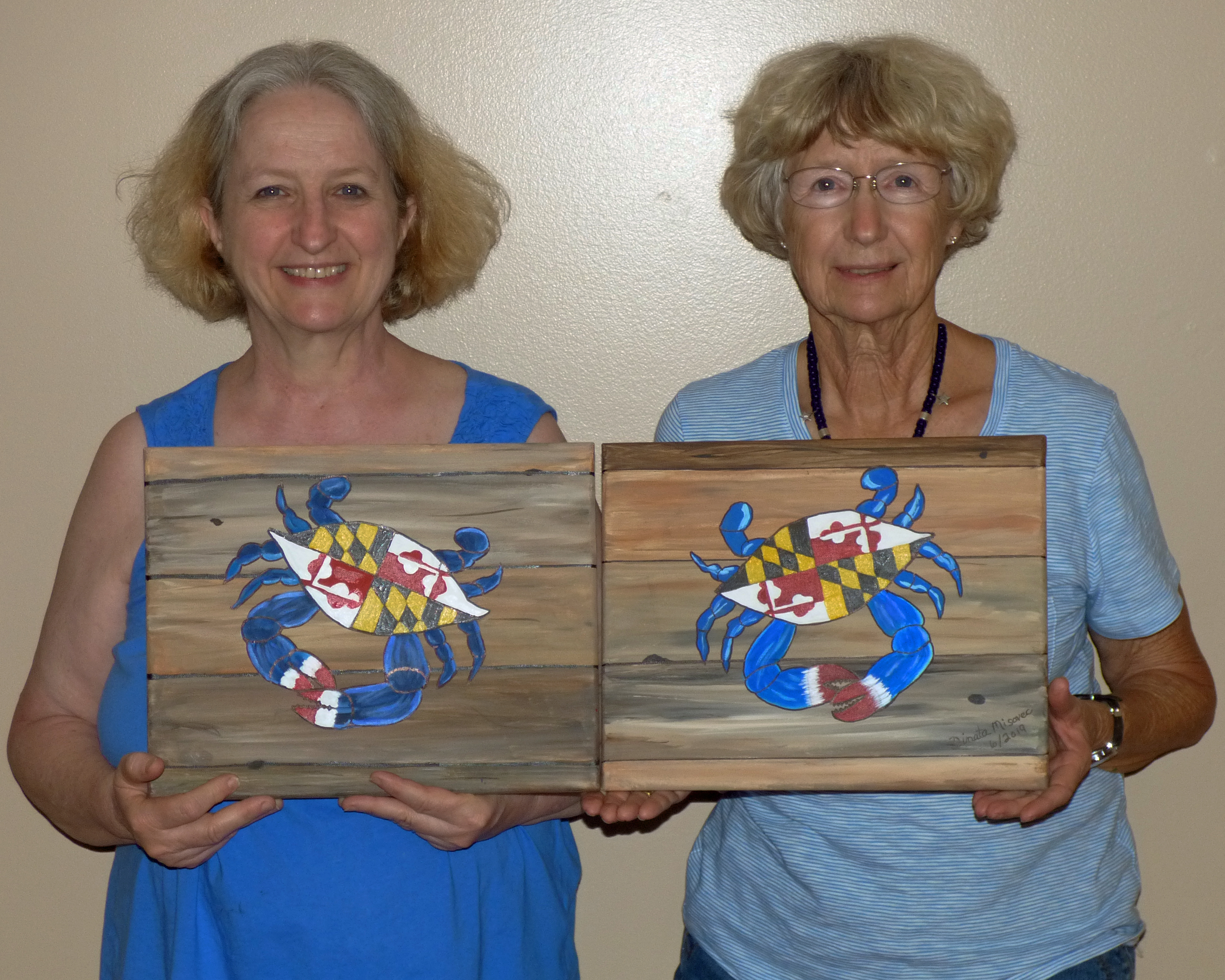 Next, we traced the crab onto the dried background, nibbling more snacks while the paint dried. We also walked around to check out everyone else’s work. All that was left was to paint the crab. For those who don’t know, that is part of the Maryland state flag on the crab’s shell. That crab/flag has become the defacto state logo. It is on everything these days. (I got the t-shirt.)