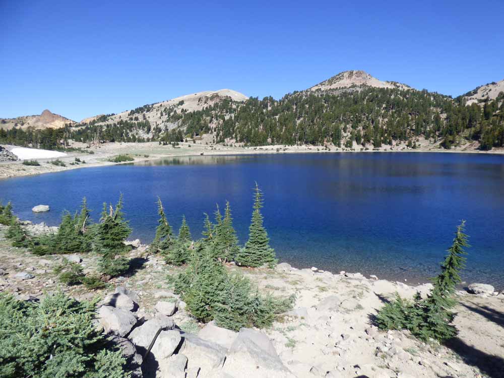 This is Lake Helen. The blue is just and blue and colorful around the shore as Crater Lake was. I assumed it was just a shallow spot that gathered rain and snow and was surprised to read in our guide that it is one-hundred-ten feet deep. It is named for the first white woman to climb to Lassen’s peak. I still haven’t learned to stitch two photos together, so here is Lake Helen to the left