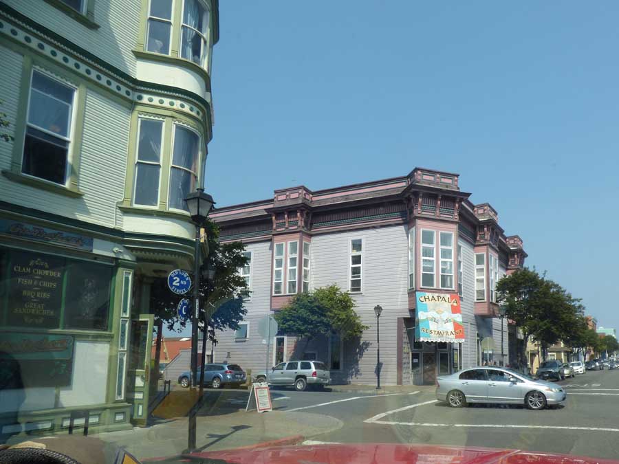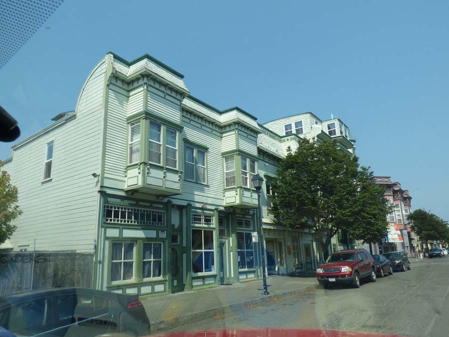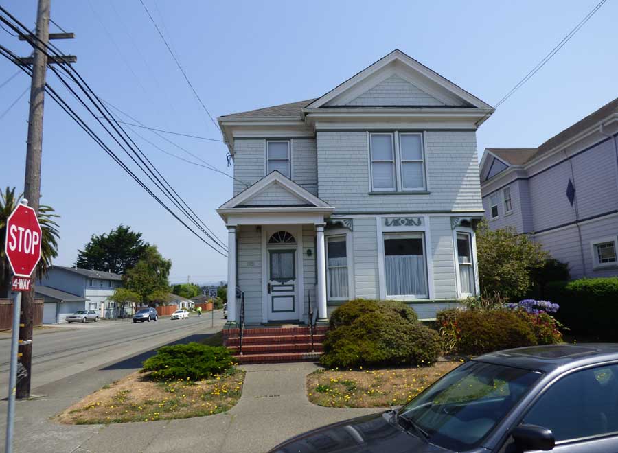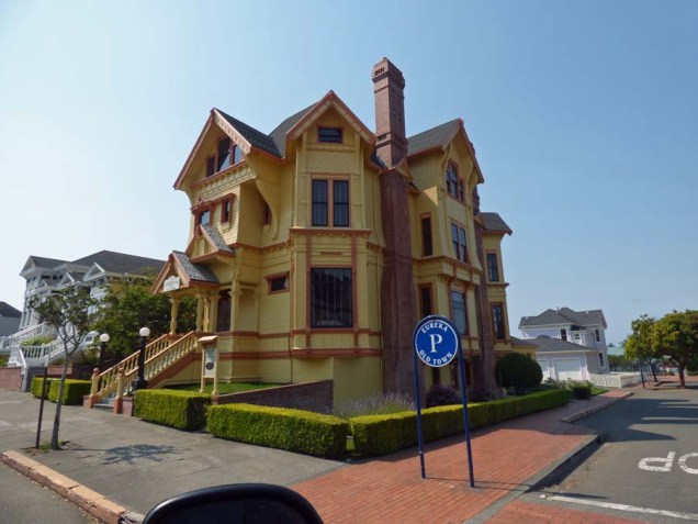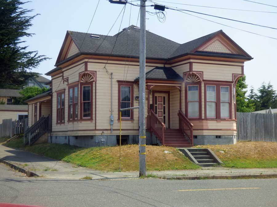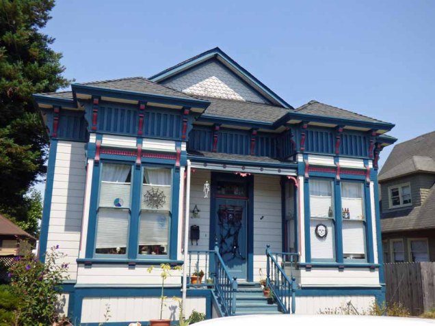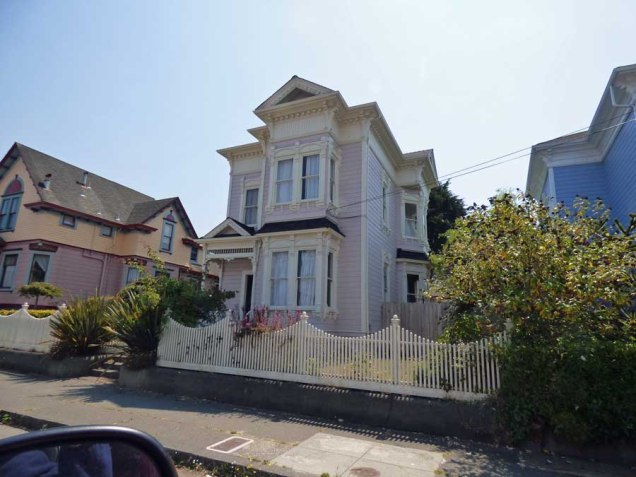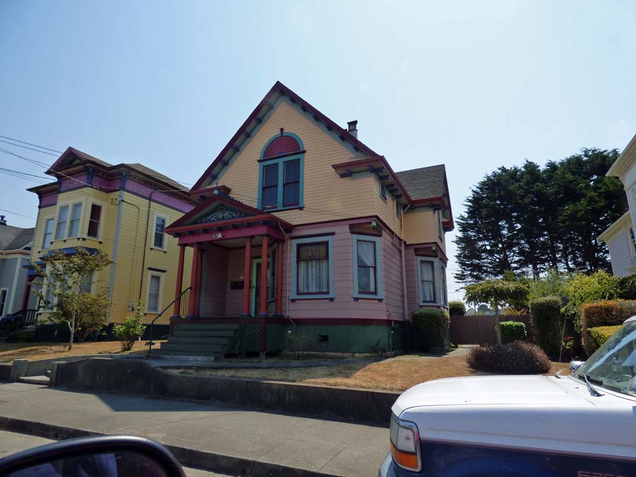 I’ve been wanting to do this for years. Today was the day. Christopher drove me around town, up and down the residential streets and through the Old Town downtown. I sat in the front passenger seat with the window down while Andy was squeezed into the pickup truck back seat. Most of the time, Christopher stopped (or, at least, paused) for me to take pictures of some of the Eureka architecture. There are so many interesting homes and other building in this town. It is an old town, founded here due to the natural port of Humboldt Bay, fishing, redwood logging, and the gold rush. There are 1,500 buildings which qualify for the National Register of Historic Places. While other cities have modernized, Eureka has maintained many of those old buildings in excellent condition. Wikipedia has a thorough write-up on this small city.