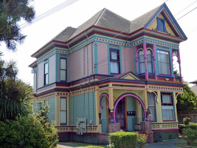 I think someone got carried away with the pain colors here. I like it! But, my understanding of the Victorian painted ladies is that they are three colors: primary, secondary, and tertiary. This one is a riot of exuberance.